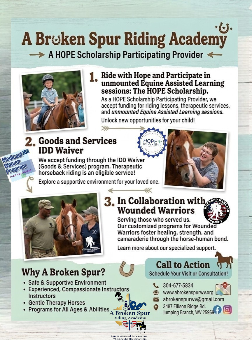 A Broken Spur Riding Academy is a 501(c)(3) Nonprofit organization and PATH Intl Member Center Specializing in Equine Assisted Services including Therapeutic Horsemanship to Individuals with Disabilities, Veterans and Able bodied individuals